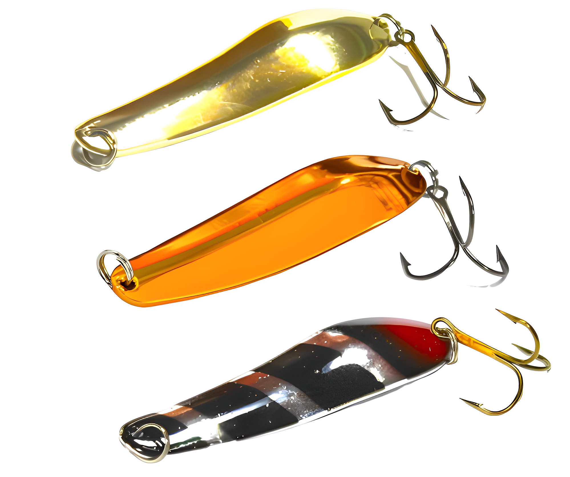 •  Плоские (классические) блесны. Изготавливаются из листового металла толщиной от 0,5 до 3,0 мм методом штамповки. Чем глубже штамповка, тем более стабильной становится игра блесны, хотя и менее активной по амплитуде. Плоские блесны легко играют, но они более склонны к срыву во вращение. Однако, игра во многом зависит от изгибов блесны. Чем больше продольных изгибов, тем устойчивее и активнее игра. Иногда даже небольшое различие в геометрии блесны существенно влияет на количество поклёвок. Выбор таких блесен индивидуален и зависит от предпочтений хищника в данный момент времени.